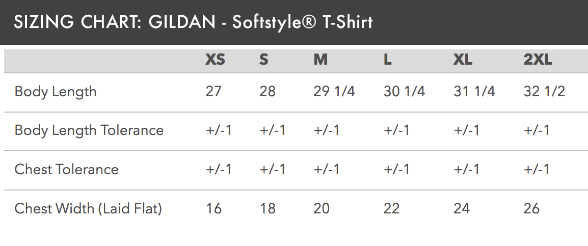 Shirts are Gildan Soft-Style 100% cotton unisex tees, available in S/M/L/XL/XXL.