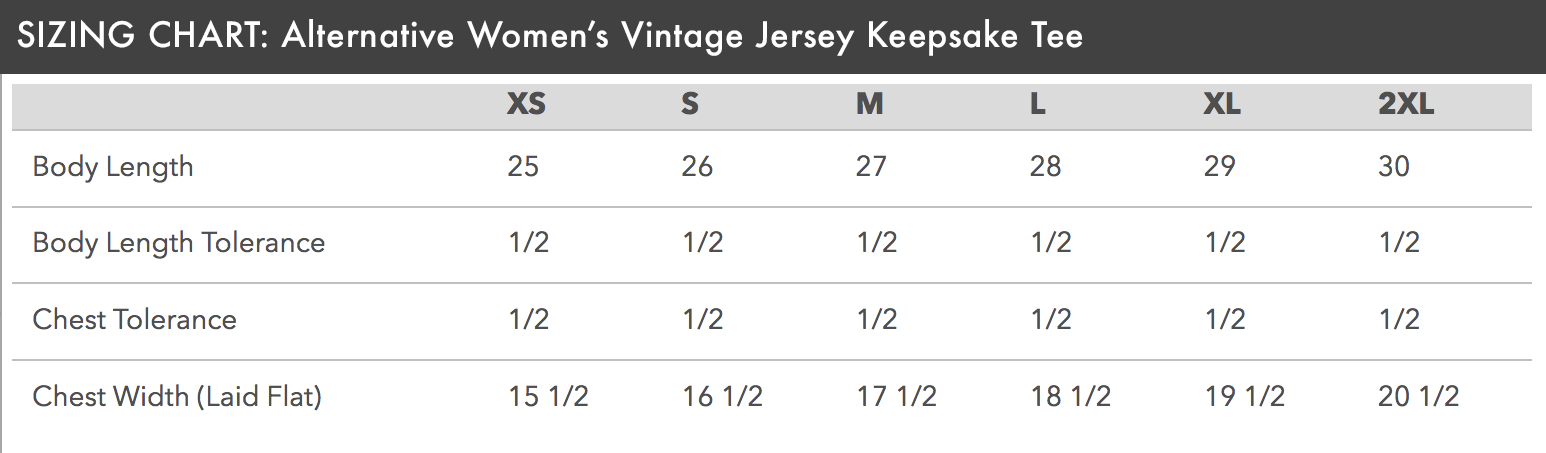 • Ladies' cut shirts are made by Alternative, and are a very soft and stretchy 50/50 blend. They run super small (surprise surprise), so please check the sizing chart if you're at all unfamiliar with the brand. Roughly speaking, their XXL is equivalent to a typical unisex L.